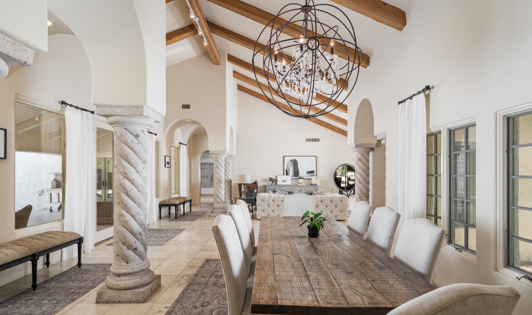 From the time you arrive at the curb, you are greeted by mature landscaping and a convenient circular driveway with plenty of parking for your guests. Once through the beautiful arched door, you’ll feel enlightened by the flood of warm natural light and soaring vaulted wood beamed ceilings. Stroll down the bright arched hallway to the private owner’s suite complete with a cozy sitting area to snuggle up to a mesmerizing fire. You won’t be able to resist entertaining your friends in the professional quality kitchen with a large L-shaped island where they can sip their favorite beverage while watching the chef prepare a meal on the gas cook top. This kitchen has it all including double ovens, two dishwashers, built-in microwave and plenty of natural light here too! Tucked away beyond the kitchen are the three additional bedrooms, or up the stairs to a loft (or 5th bedroom) with ensuite that could be used as an office or bedroom. This 5 bedroom, 3 ½ bath home situated on just over an acre (1.2 acres) is crowned with an entertainer’s dream back yard. The enormous sparkling blue pool, outdoor kitchen, firepit and large covered patio will thrill your guests. If you’re not into tennis, perhaps convert the tennis court to pickle ball, or basketball? There is plenty of space to build a guest suite, or let your imagination take you away. You’re just minutes away from Sanctuary Resort & Spa, one off the most luxurious resorts in the valley. Also nearby the Borgata of Scottsdale and Scottsdale Fashion Square for world class shopping. Bring on your most inspired daydream as you visualize yourself already moved in!